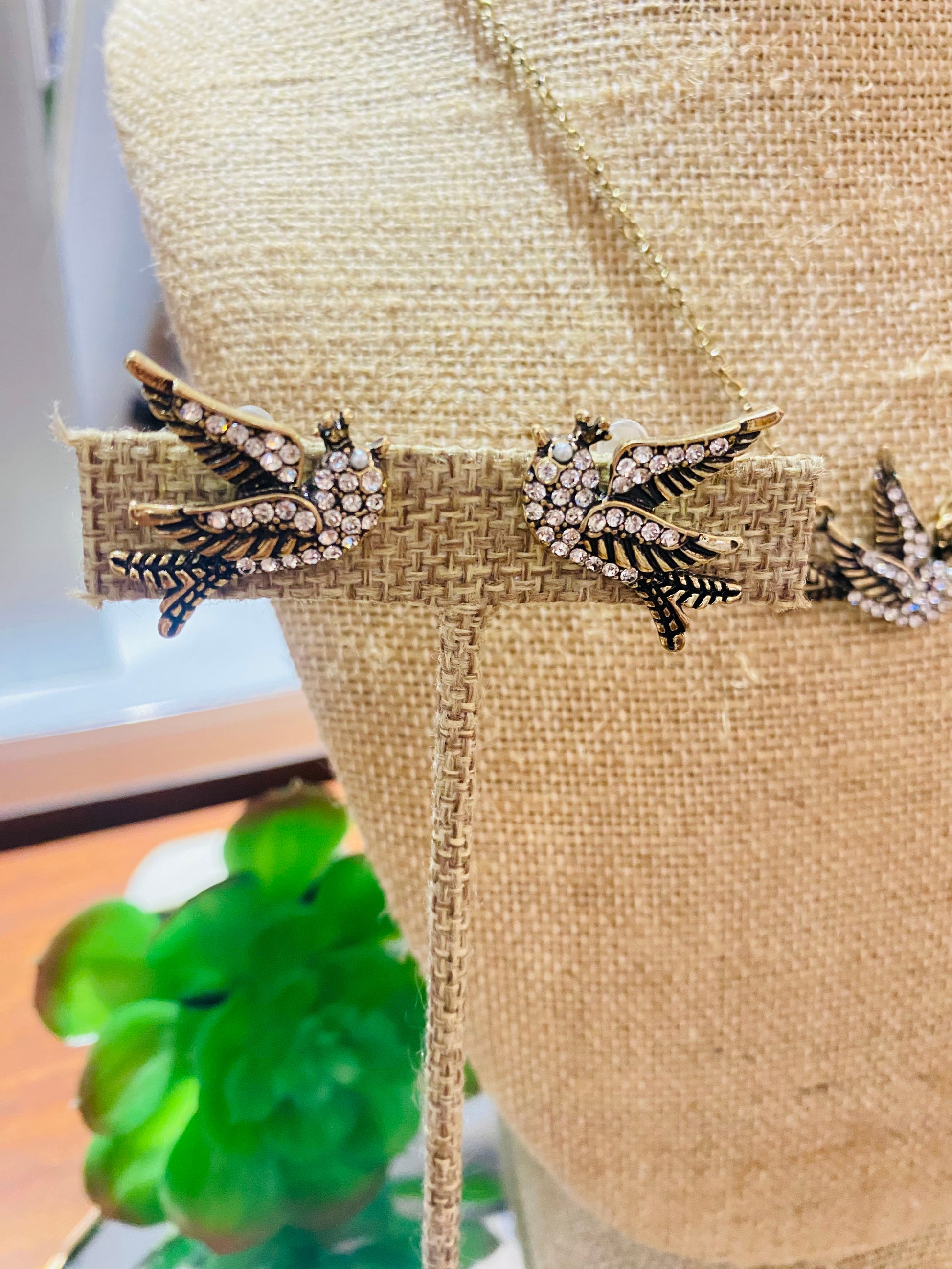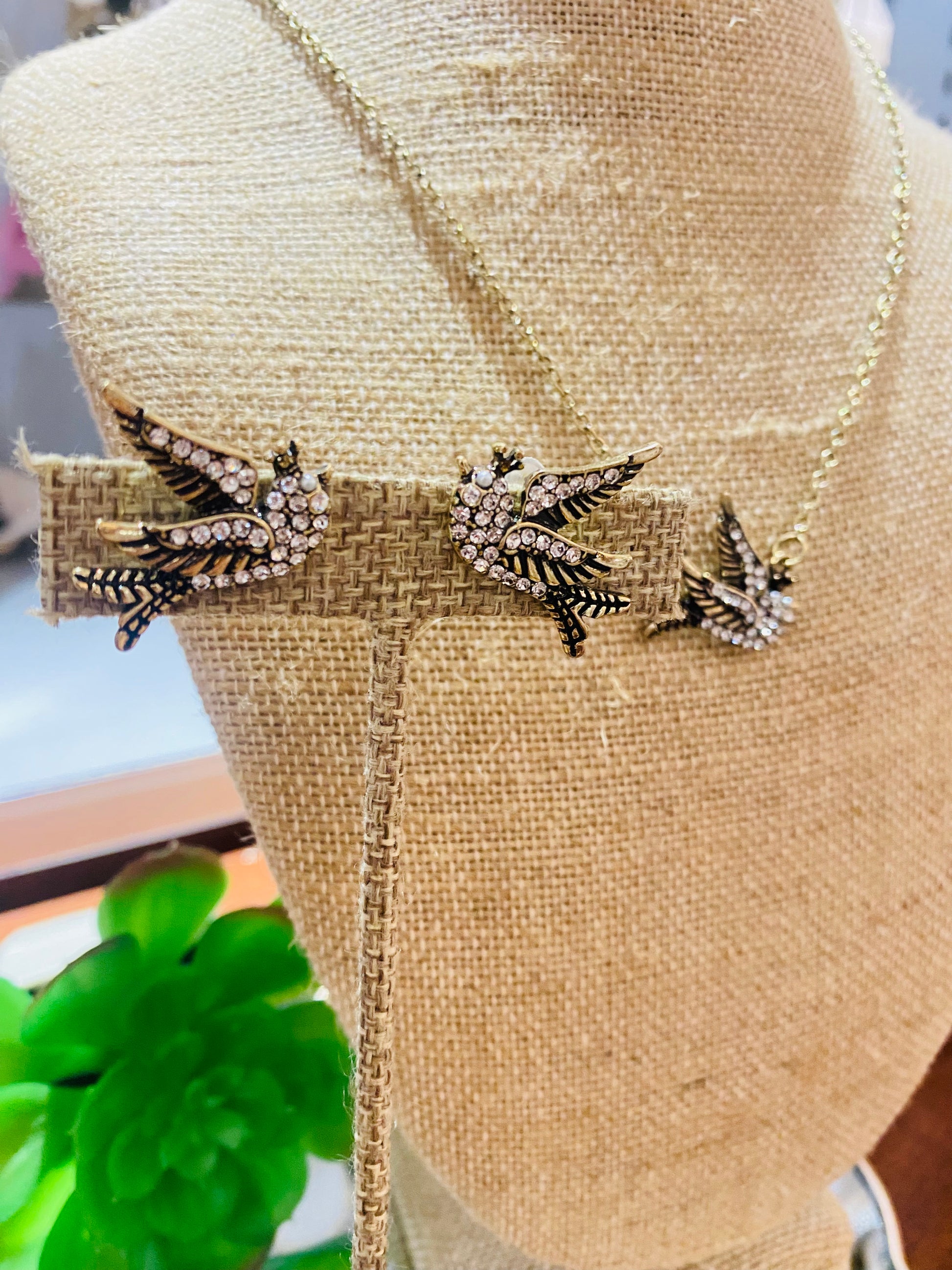 Set de aretes y collar color bronce con detalles de piedras y perlitas